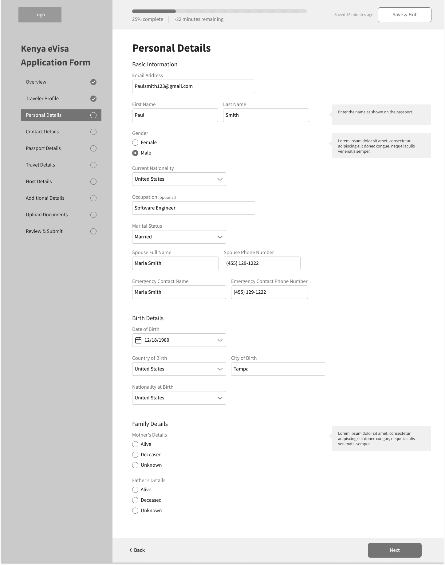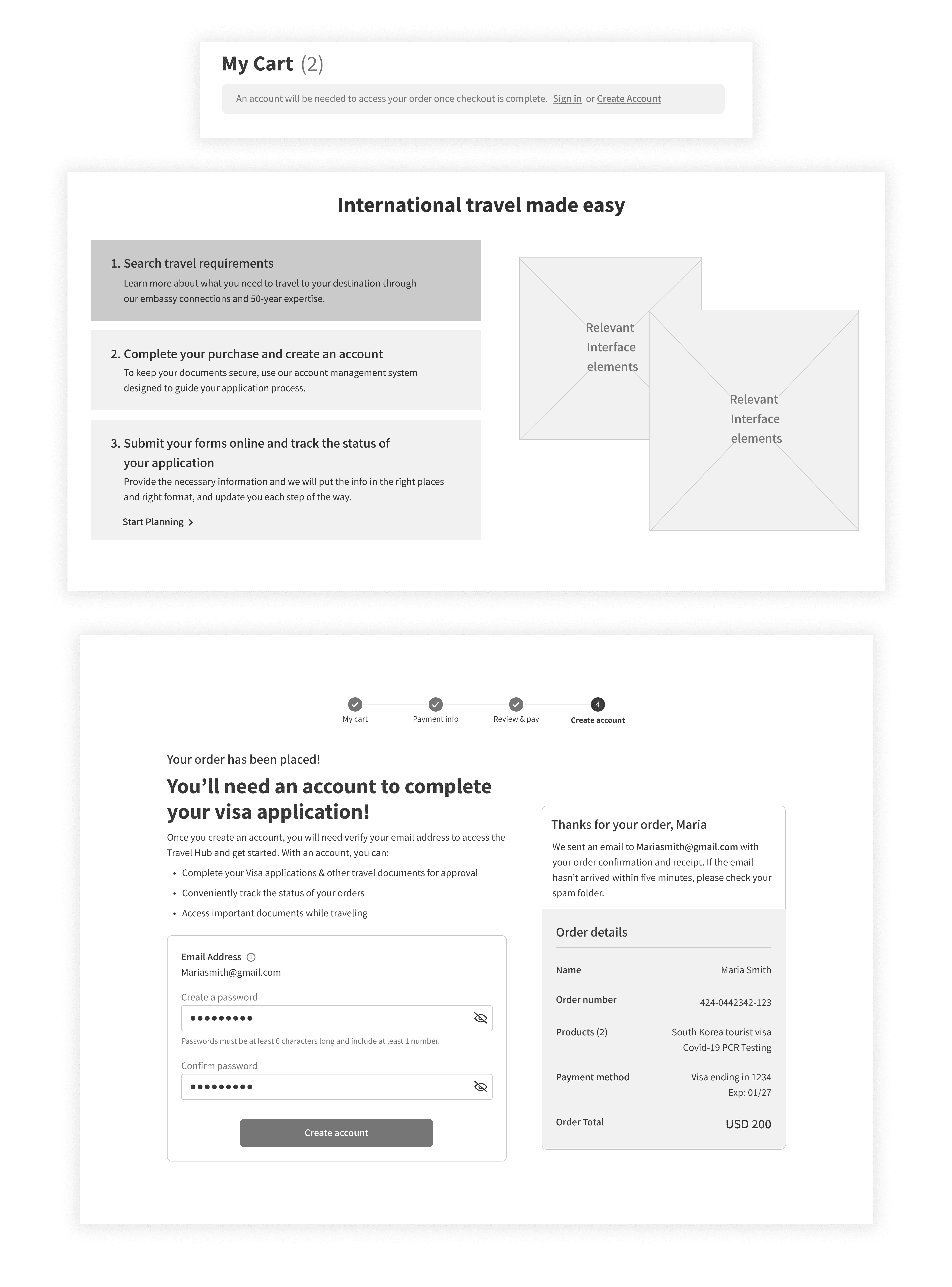 Based on our research and workshop findings, we proceeded to iterate with wireframes. These concepts address key user and business needs by improving usability, transparency, and trust in the visa application process.