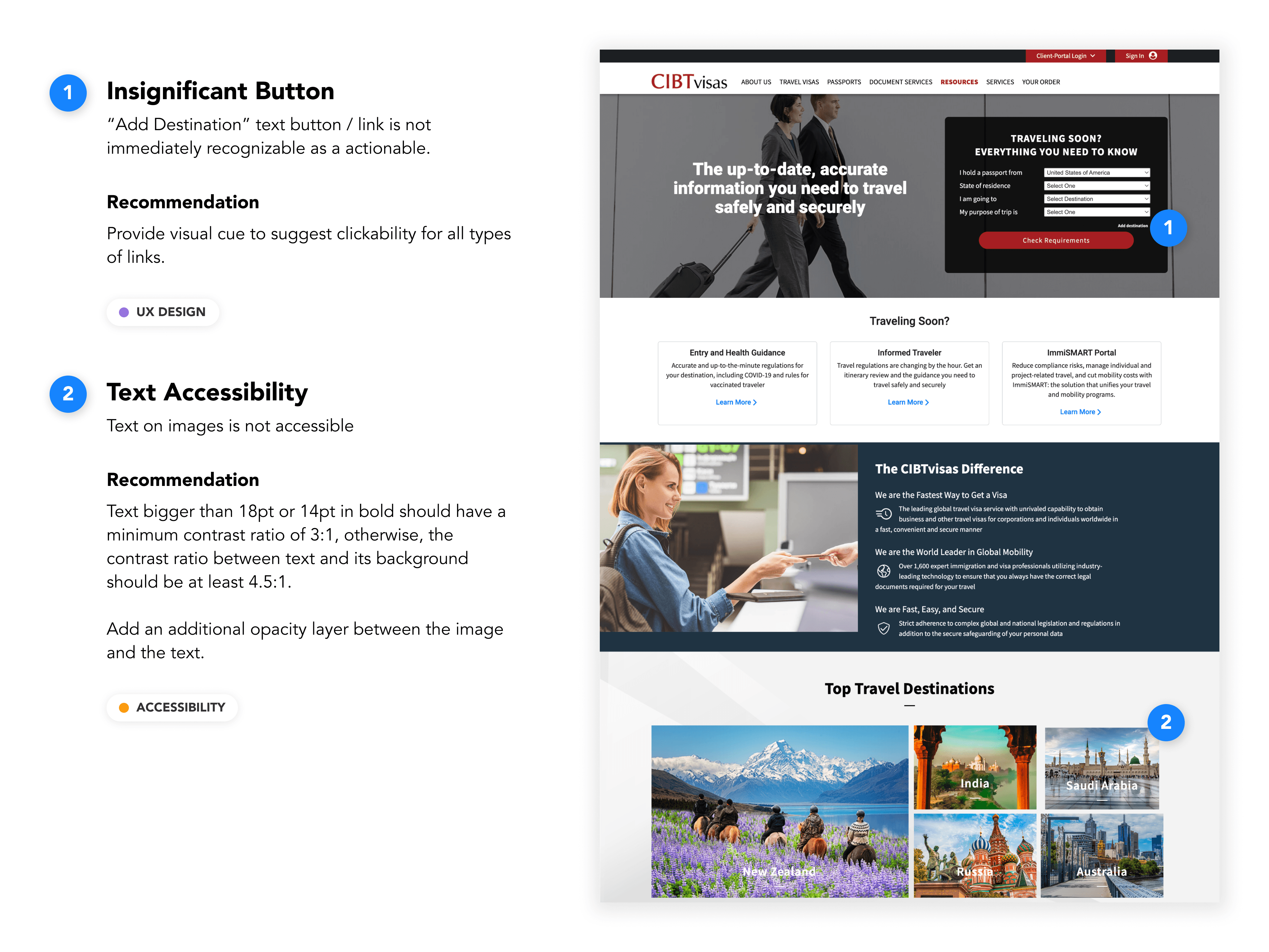 We audited CIBTVisas.com, focusing on visa-related sections to identify design gaps and improve the user experience. Our goal was to set industry standards and guide the new direct-to-consumer site. We focused on three key areas: Accessibility, UX Design, and Visual Design.