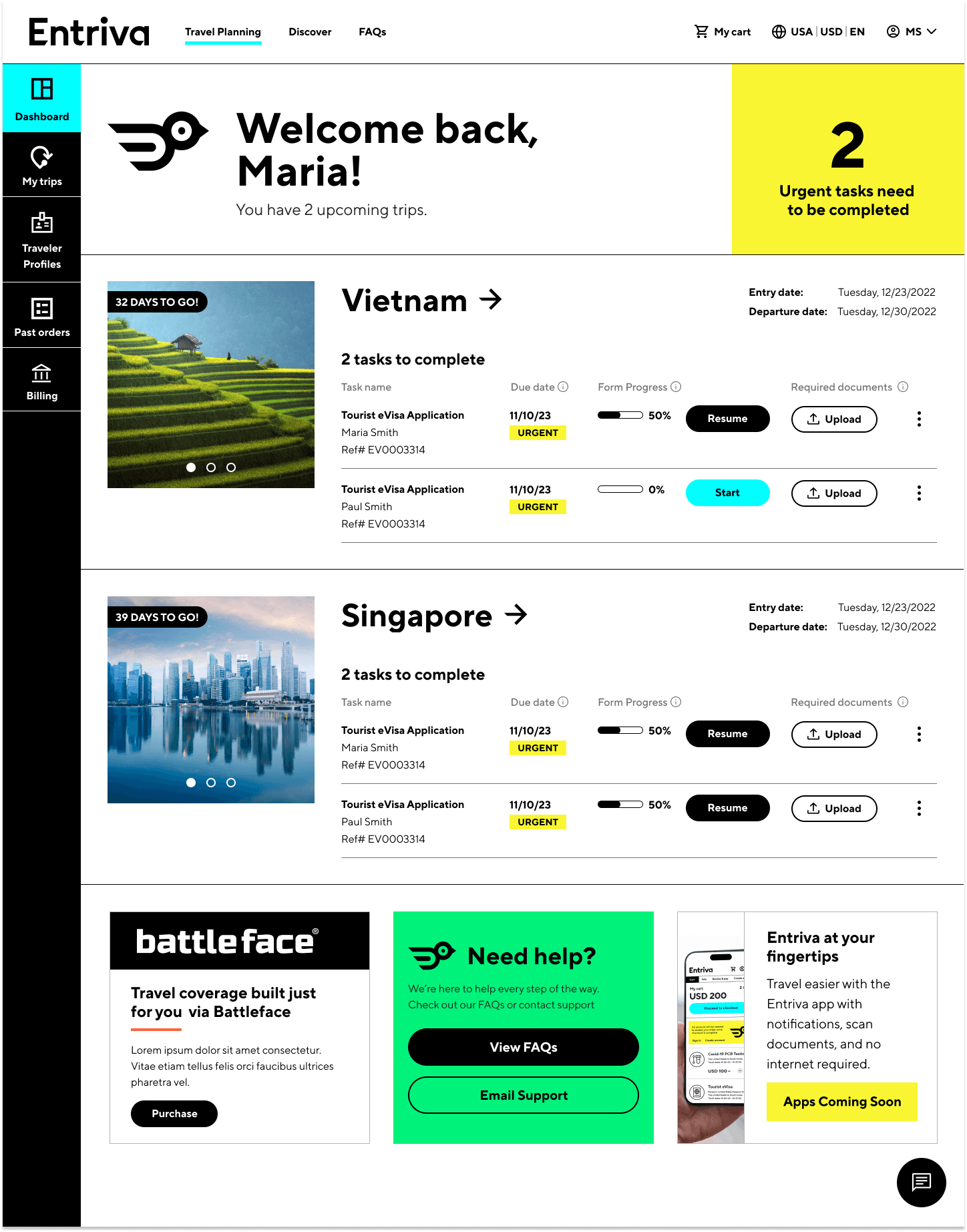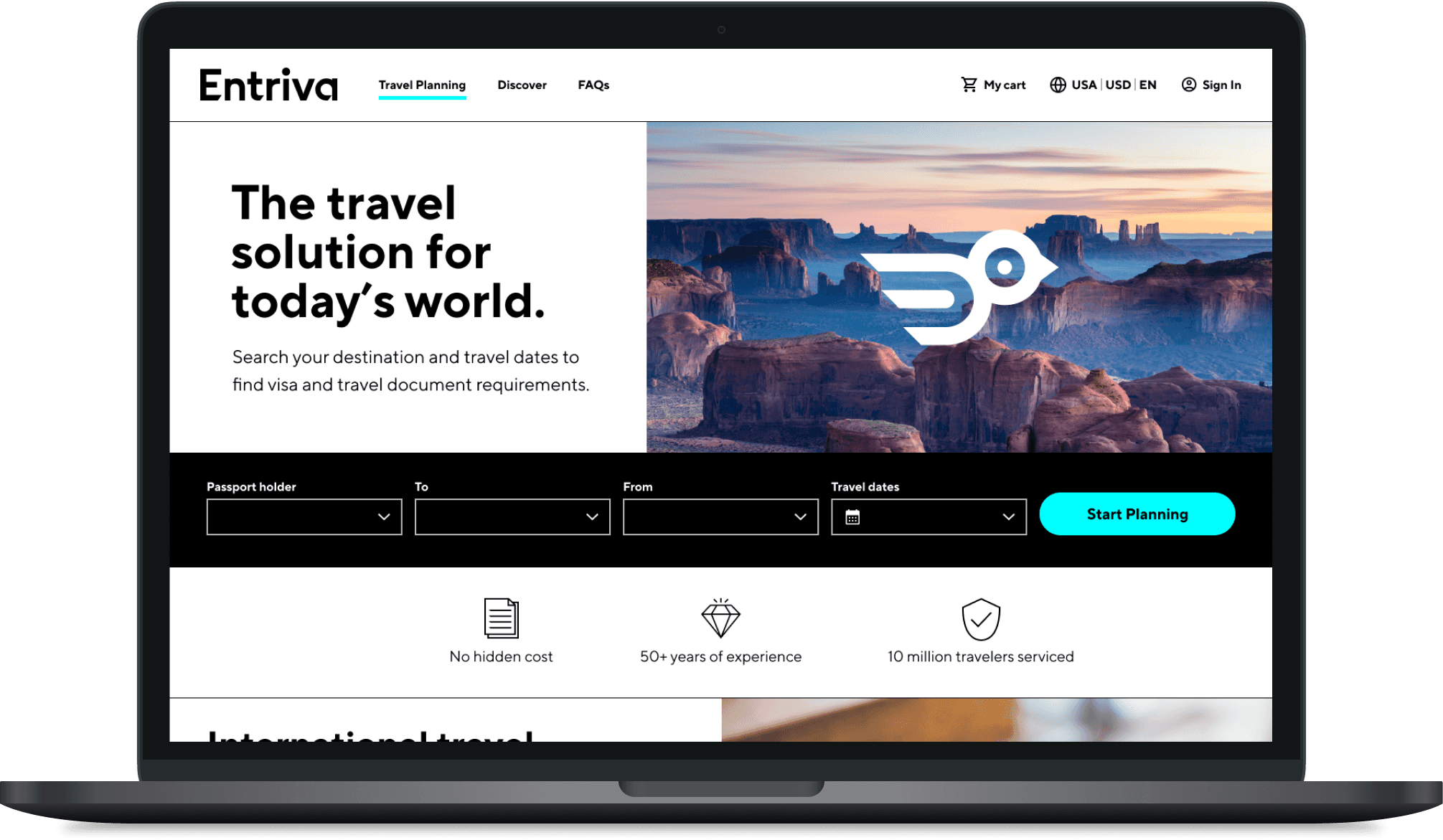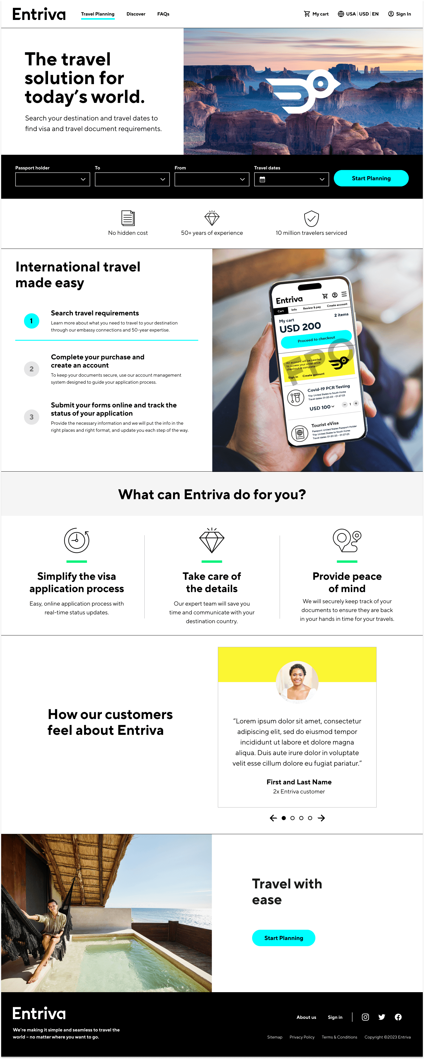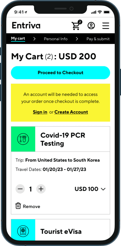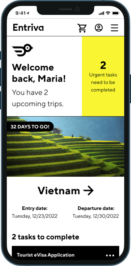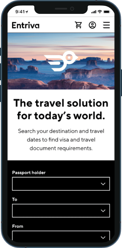 I collaborated on designing MVP recommendations for Entriva, a new direct-to-consumer product by CIBTvisas, a global visa and passport services company. Due to limited internal resources, CIBT partnered with WillowTree for user research, product validation, and UX design, while Siegel & Gale developed the brand identity, including naming, research, and branding guidelines.