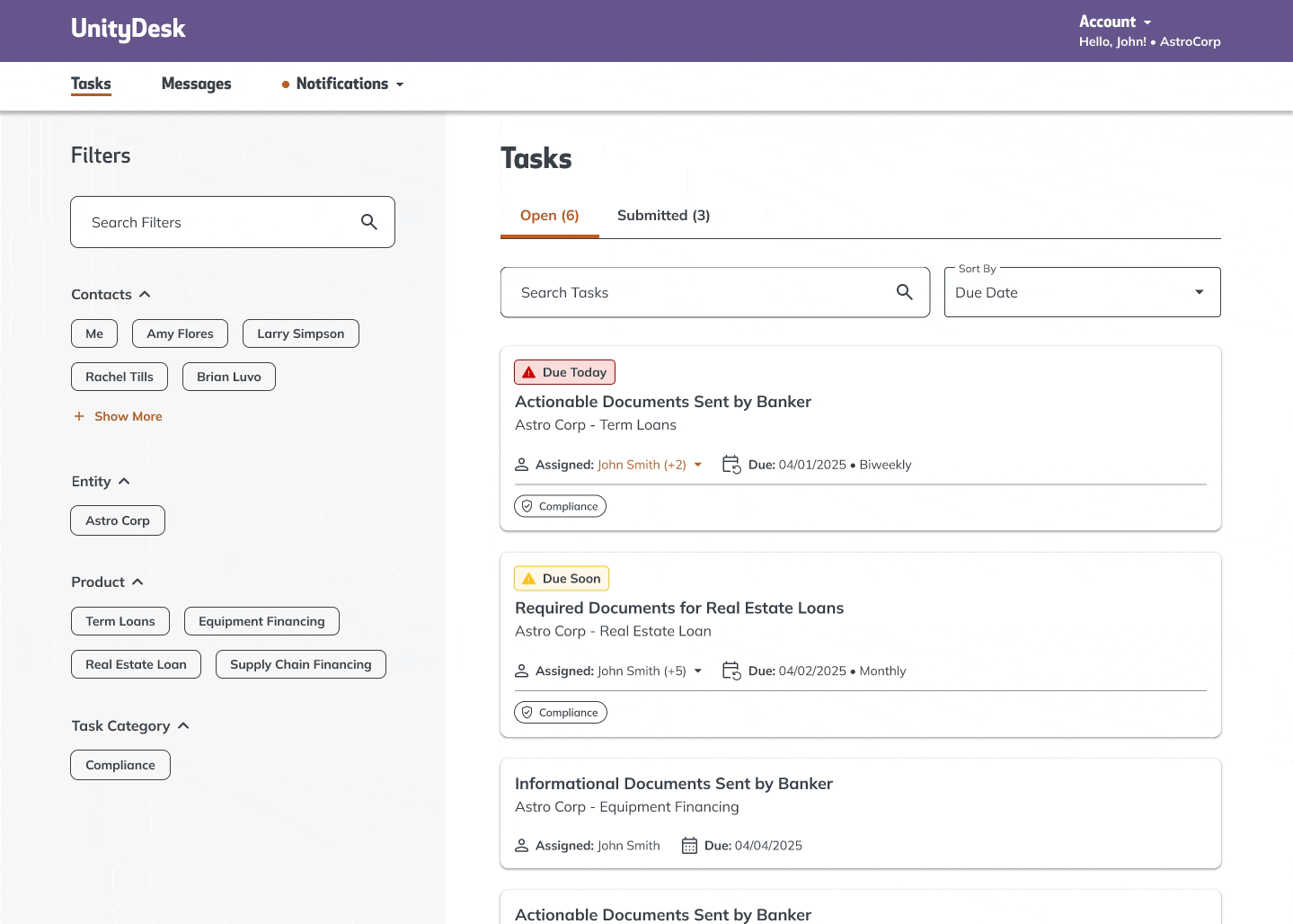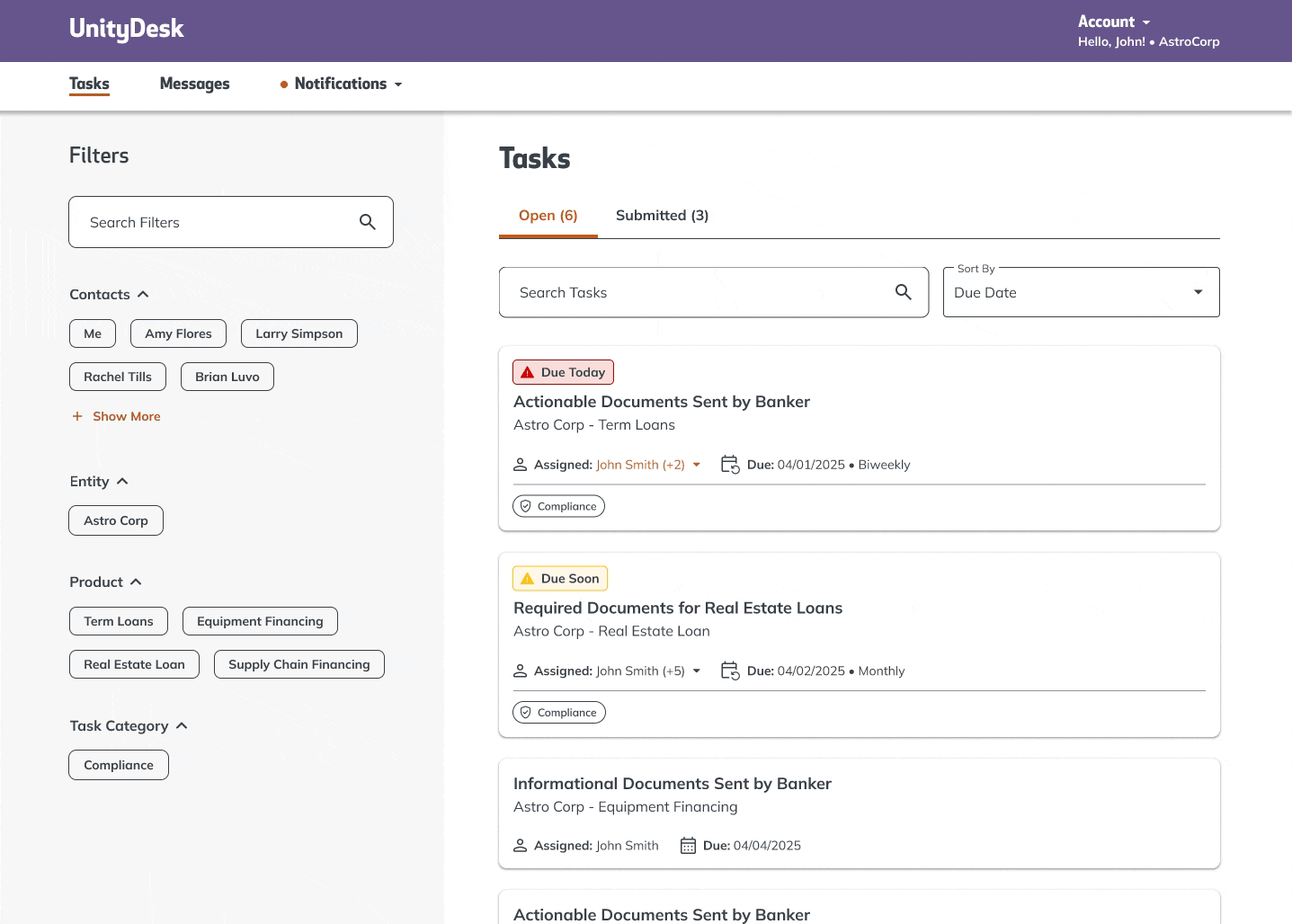 The Task Page centralizes loan document management, reducing manual follow-ups and inefficiencies. With sorting and filtering options, customers can quickly find outstanding tasks, ensuring a smoother loan process while minimizing delays and workload for bank employees.